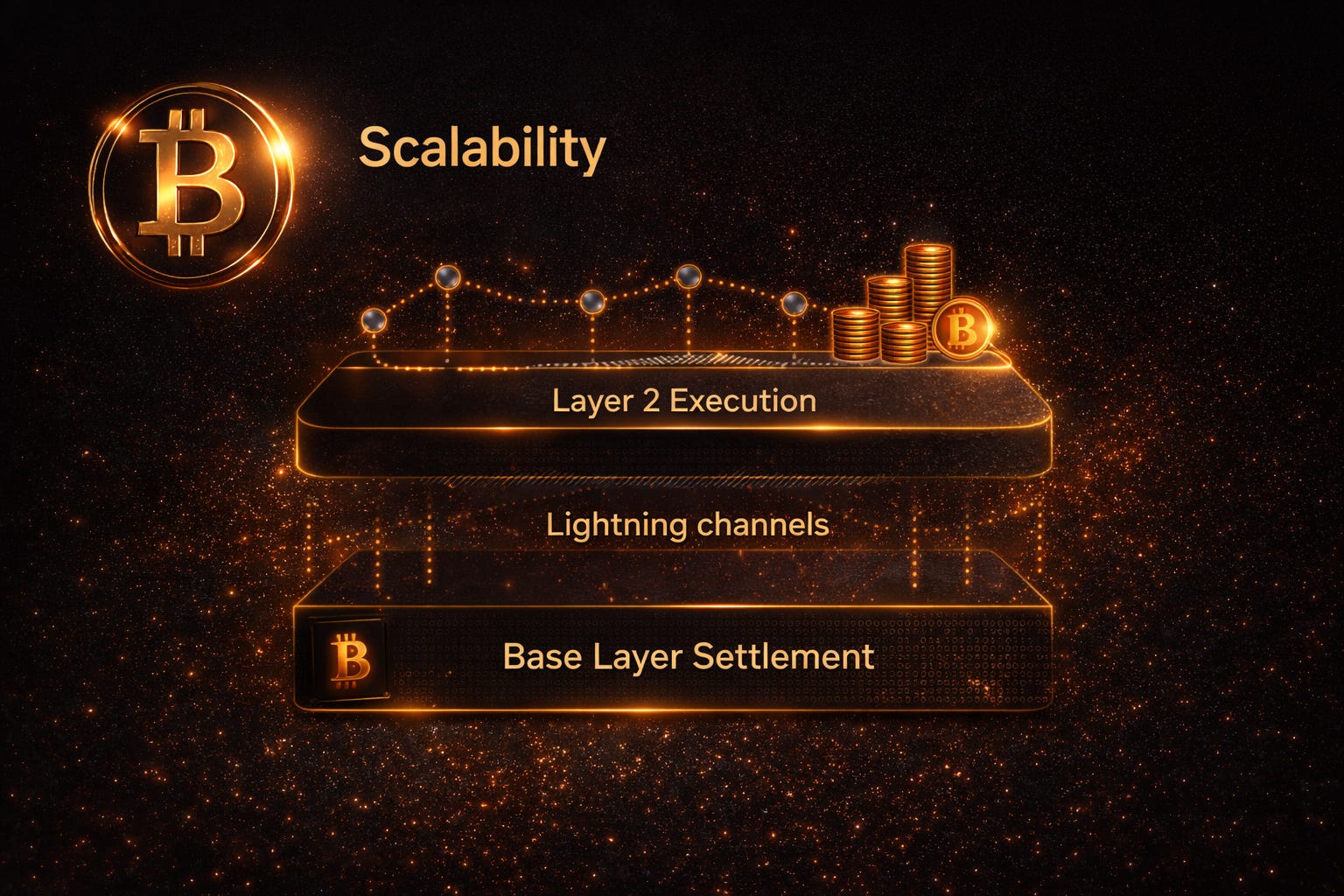Bitcoin’s primary scaling solution is the Lightning Network, a Layer 2 protocol that enables off chain micropayments with near instant settlement and very low fees.