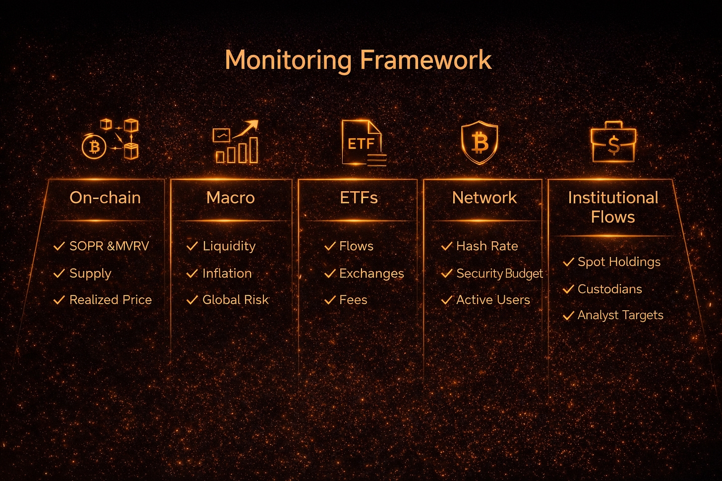 This framework outlines the key indicators used to assess Bitcoin’s evolving market state across on-chain activity, macro conditions, institutional behavior, and protocol development.