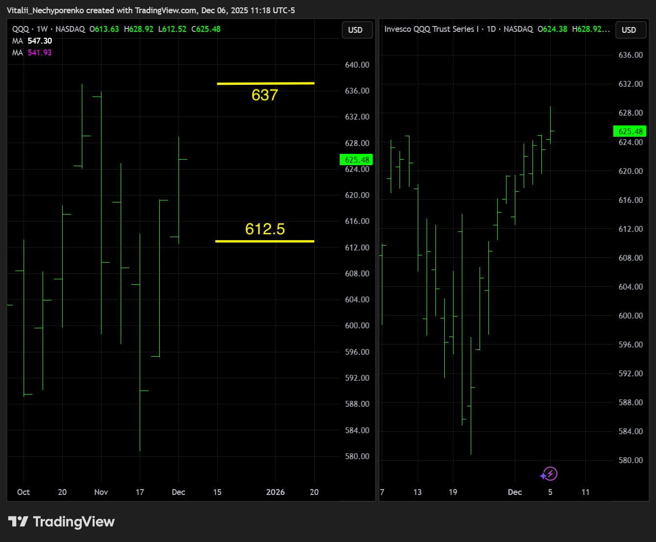 The Nasdaq 100 ETF showed some respect to the mentioned 627.50 level, though for now it remains more of a reference point than a decisive level. Key resistance to watch is still 637 at the all time high, while key support shifts higher to 612.5, matching this week’s pivot low.