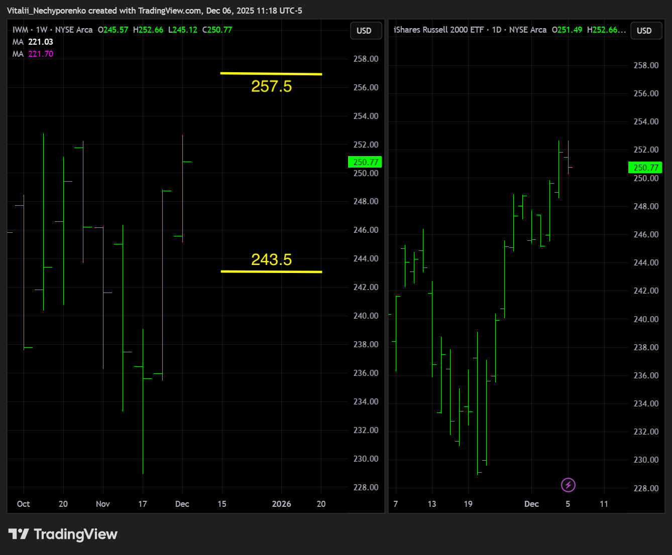 The Russell 2000 ETF did not clear the all time high but came as close as possible before a slight pullback on Friday. The next test of that level should tell us more, with key resistance shifting to 257.5 in line with the weekly TRL angle, while key support moves up to 243.5.